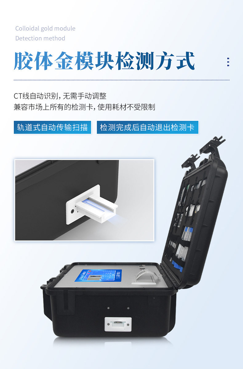 7、膠體金模塊檢測方式:軌道式自動(dòng)傳輸掃描,檢測完成后自動(dòng)退出檢測卡。