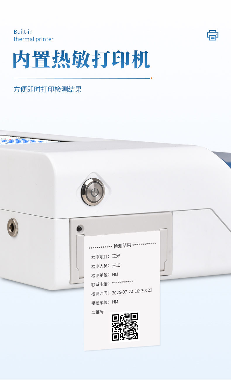 7、 內置熱敏打印機,可及時(shí)打印檢測信息,檢測數據可上傳監管平臺功能。