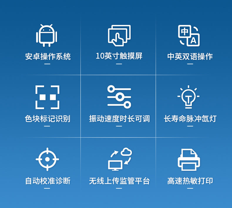 【產(chǎn)品簡(jiǎn)介】Android 10操作系統,10英寸高清觸摸屏,中/英文雙語(yǔ)操作系統,自動(dòng)化完成檢測、數據存儲及報告生成