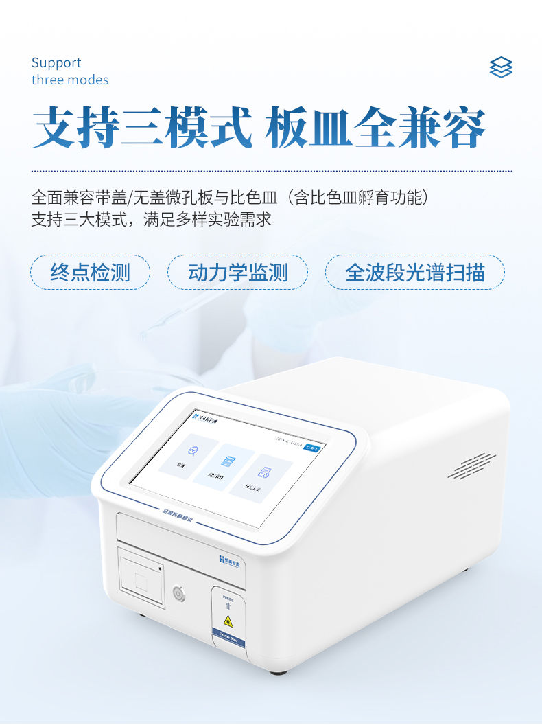 8. 支持終點(diǎn)檢測、動(dòng)力學(xué)監測、全波段光譜掃描三大模式,兼容帶蓋/無(wú)蓋微孔板及比色皿(含比色皿孵育功能);