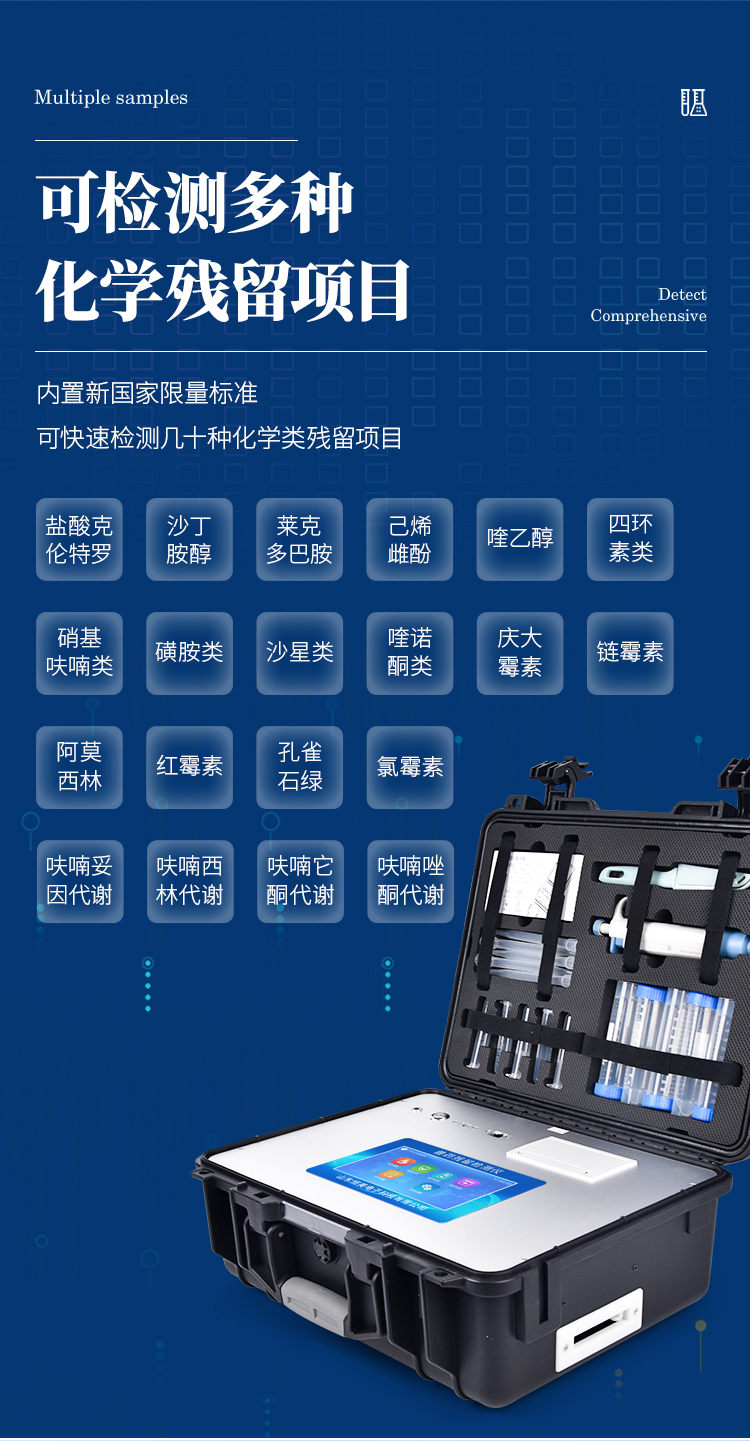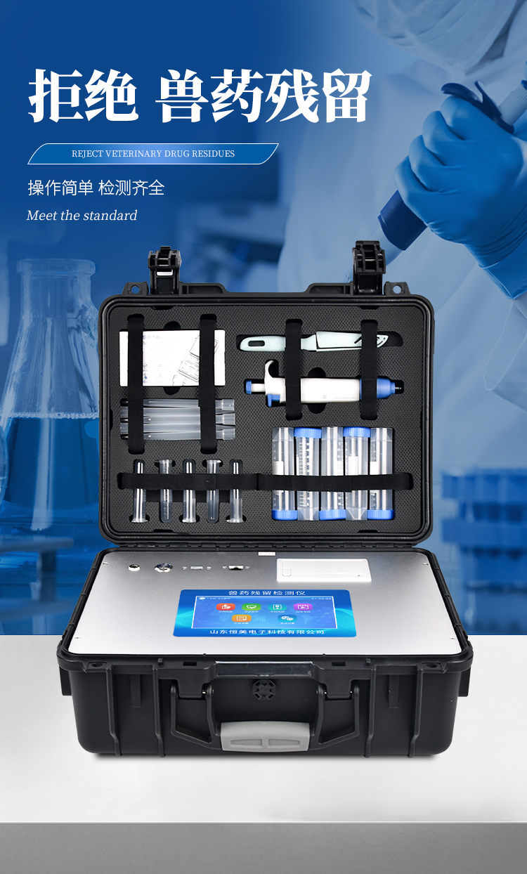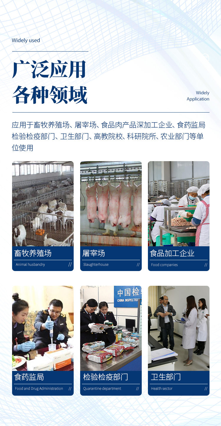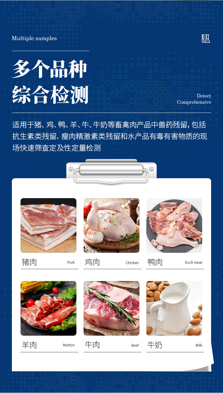 獸藥殘留檢測儀適用于豬、雞、鴨、羊、牛、牛奶等畜禽肉產(chǎn)品中獸藥殘留,包括抗生素類(lèi)殘留、瘦肉精激素類(lèi)殘留和水產(chǎn)品有毒有害物質(zhì)的現場(chǎng)快速篩查定及性定量檢測。