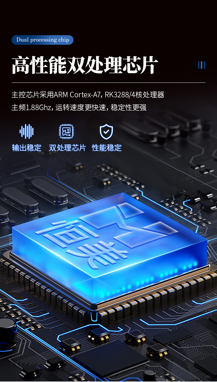 1、主控芯片采用ARM Cortex-A7,RK3288/4核處理器,主頻1.88Ghz,運轉速度更快速,穩定性更強。