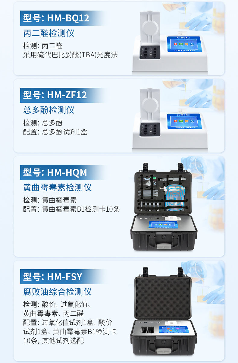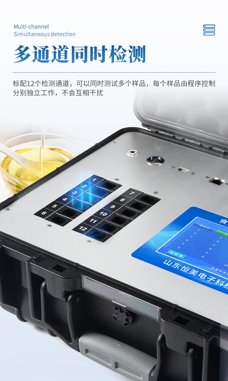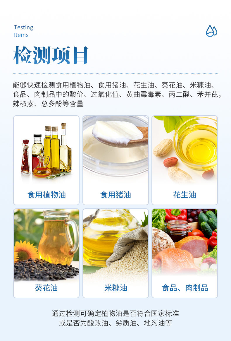 腐敗油綜合檢測檢測儀為集成化油品快速檢測分析設備,能夠快速檢測食用植物油、食用豬油、花生油、葵花油、米糠油、食品、肉制品中的酸價(jià)、過(guò)氧化值、黃曲霉毒素等含量;通過(guò)檢測可確定植物油是否符合國家標準或是否為酸敗油、劣質(zhì)油、地溝油等。儀器預留其他項目檢測程序和端口,根據日后需求可方便的自主增加檢測項目。日后可升級為檢測水產(chǎn)品、面制品的綜合類(lèi)型儀器。