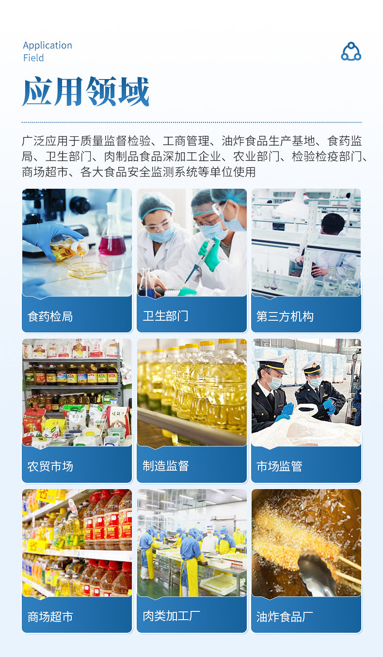 廣泛應用于質(zhì)量監督檢驗、工商管理、油炸食品生產(chǎn)基地、食藥監局、衛生部門(mén)、肉制品食品深加工企業(yè)、農業(yè)部門(mén)、檢驗檢疫部門(mén)、商場(chǎng)超市、各大食品安全監測系統等單位使用。