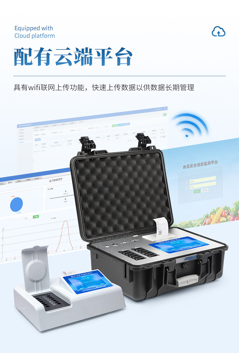 4、儀器帶有監管平臺,數據可局域網(wǎng)和互聯(lián)網(wǎng)數據上傳,檢測結果直接傳至食品安全監管平臺。進(jìn)行區域食品安全監管及大數據分析處理與數據統計,檢測區域食品安全長(cháng)短期動(dòng)態(tài),達到食品安全問(wèn)題預估、預警